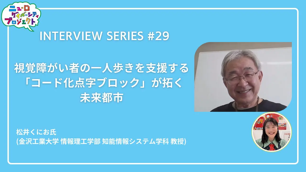 NEWS #ニューロダイバーシティプロジェクト ニューロダイバーシティプロジェクト インタビューシリーズ第29回 2026.1.16 国内外のニューロダイバーシティに関連する最先端の研究や活動に焦点を当て、インタビュー形式でお届けするシリーズ第29回は、「視覚障がい者の一人歩きを支援する 『コード化点字ブロック』が拓く未来都市」。 レポートと動画を公開しましたので、 是非ご覧ください!