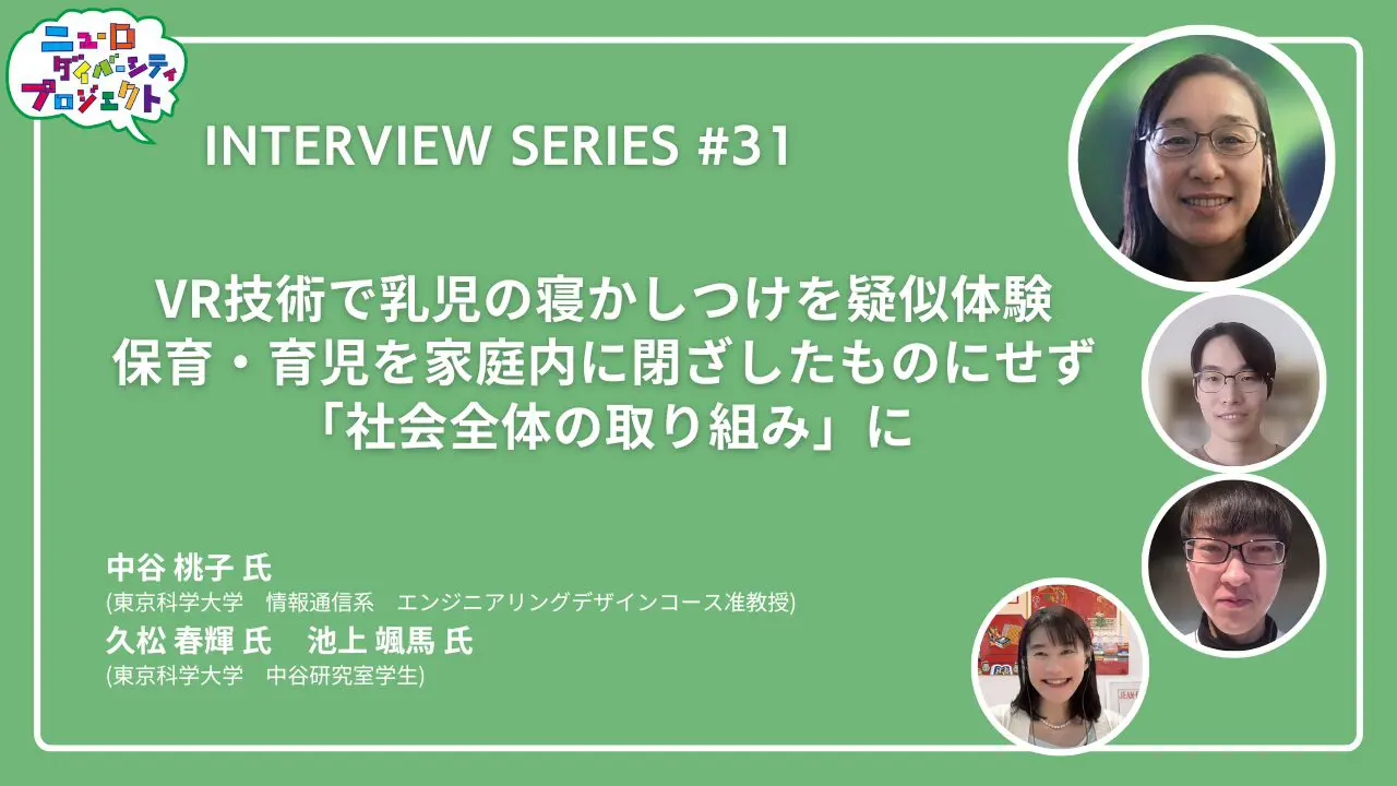 NEWS #ニューロダイバーシティプロジェクト ニューロダイバーシティプロジェクト インタビューシリーズ第31回 2026.3.13 国内外のニューロダイバーシティに関連する最先端の研究や活動に焦点を当て、インタビュー形式でお届けするシリーズ第31回は、「VR技術で乳児の寝かしつけを疑似体験 保育・育児を家庭内に閉ざしたものにせず『社会全体の取り組み』に」。 レポートと動画を公開しましたので、 是非ご覧ください!