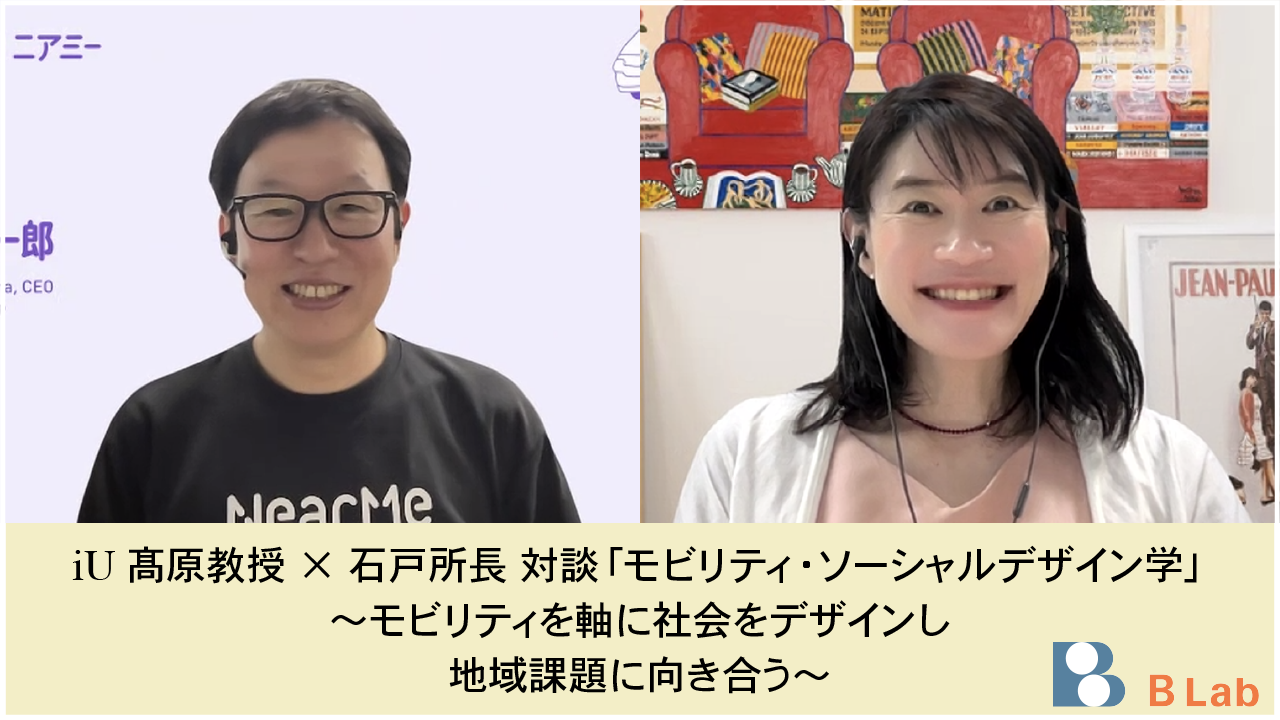 今回は2025年4月からiUの教員に就任された株式会社NearMe(以下、ニアミーとする)の代表取締役社長である髙原幸一郎 氏(▲写真1▲)にお話を伺いました。髙原氏が主導するプロジェクト「モビリティ・ソーシャルデザイン学」とは、重要な社会インフラである移動手段(モビリティ)を軸に地域の社会課題を浮き彫りにし、解決策を導き出して社会実装していく取り組みです。具体的にどのようなプロジェクトが進行しているのでしょうか。B Lab所長の石戸奈々子(▲写真1▲)が、お聞きしました。