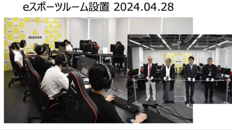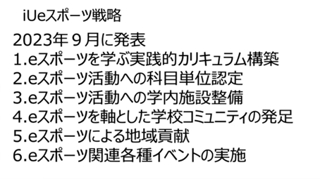江端氏:「スライドも交えながらお話しいたします。iUでは2023年9月にeスポーツ戦略を発表しました。その中では、eスポーツを学ぶ実践的カリキュラムとeスポーツ活動への科目単位認定、eスポーツ活動への学内施設の整備、eスポーツを軸とした学校コミュニティの展開、eスポーツによる地域貢献、eスポーツ関係各種イベントを実施することを目的とすると示されました。この戦略は、その後、着々と進められています。(▲写真2▲)