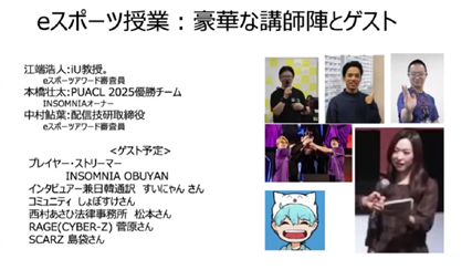 eスポーツの授業には、さまざまなゲストを呼んでいるのも特徴です。授業をしているのは、おもに私をはじめ、『インソムニア』を運営する株式会社INSの代表である本橋 壮太氏、配信技研の取締役でeスポーツアワードの審査員でもある中村 鮎葉氏の三人ですが、他にもさまざまなゲストを呼んでいます。例えば『インソムニア』のプロeスポーツプレイヤー、eスポーツの日韓通訳で韓国の事情を最もよく知っていると言われている すいにゃん氏などです。また、西村あさひ法律事務所、日本最大級のeスポーツのイベントブランドであるRAGE、プロゲーミングチームのSCARZからもゲスト講師に来ていただいています。iUでは1クラス40名、1年生は2クラス80名で授業を行っていますが、1年生の半分以上がeスポーツの授業を受けている状況です。(▲写真5▲)
