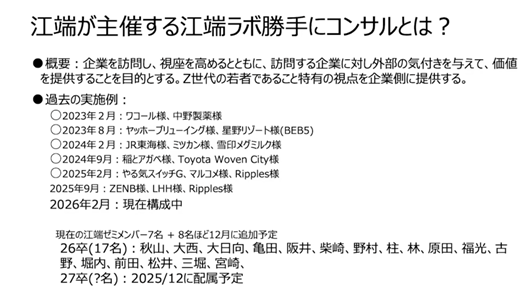 実際に行っている活動としては、例えば『勝手にコンサル』を江端ラボで実施しています。これまでに10数社実施させていただきました。コンサルといっても我々が勉強のためにやっているので、コンサルフィーをいただかずに、さまざまな会社に、『このようにしたらもっと若者にアピールできるのではないか』、『こういうプロモーションができるのではないか』と提案をしているのです。(▲写真12▲)