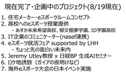 高校への授業提供では、NASEFと連携してeスポーツの授業を高校生向けに展開しています。eスポーツ就活フェアは、Adeccoグループの就活サービス・LHHと組んで、『ちょっと先のおもしろい未来』で展開させていただく予定です。